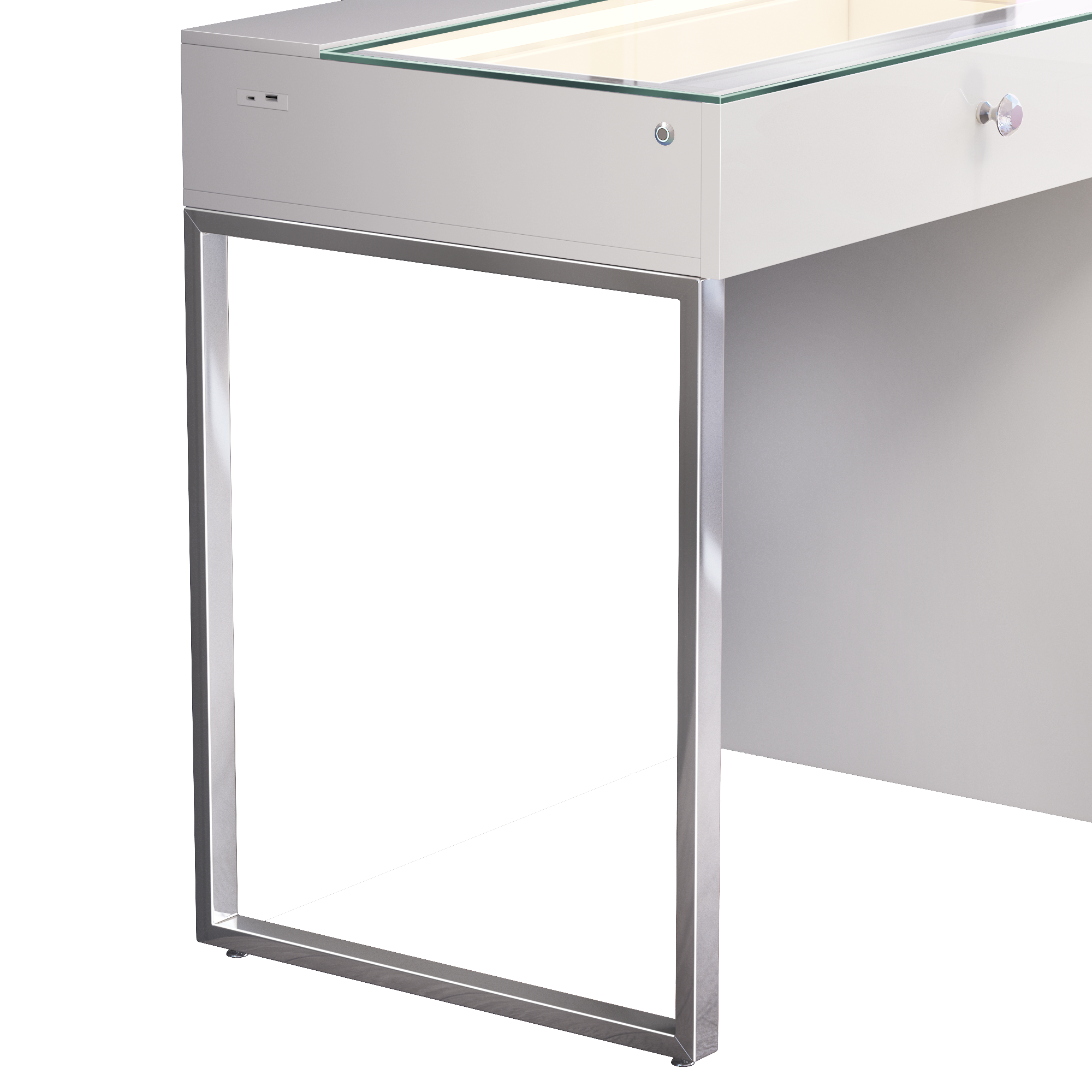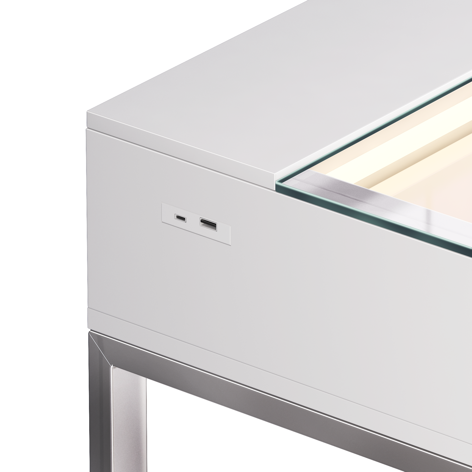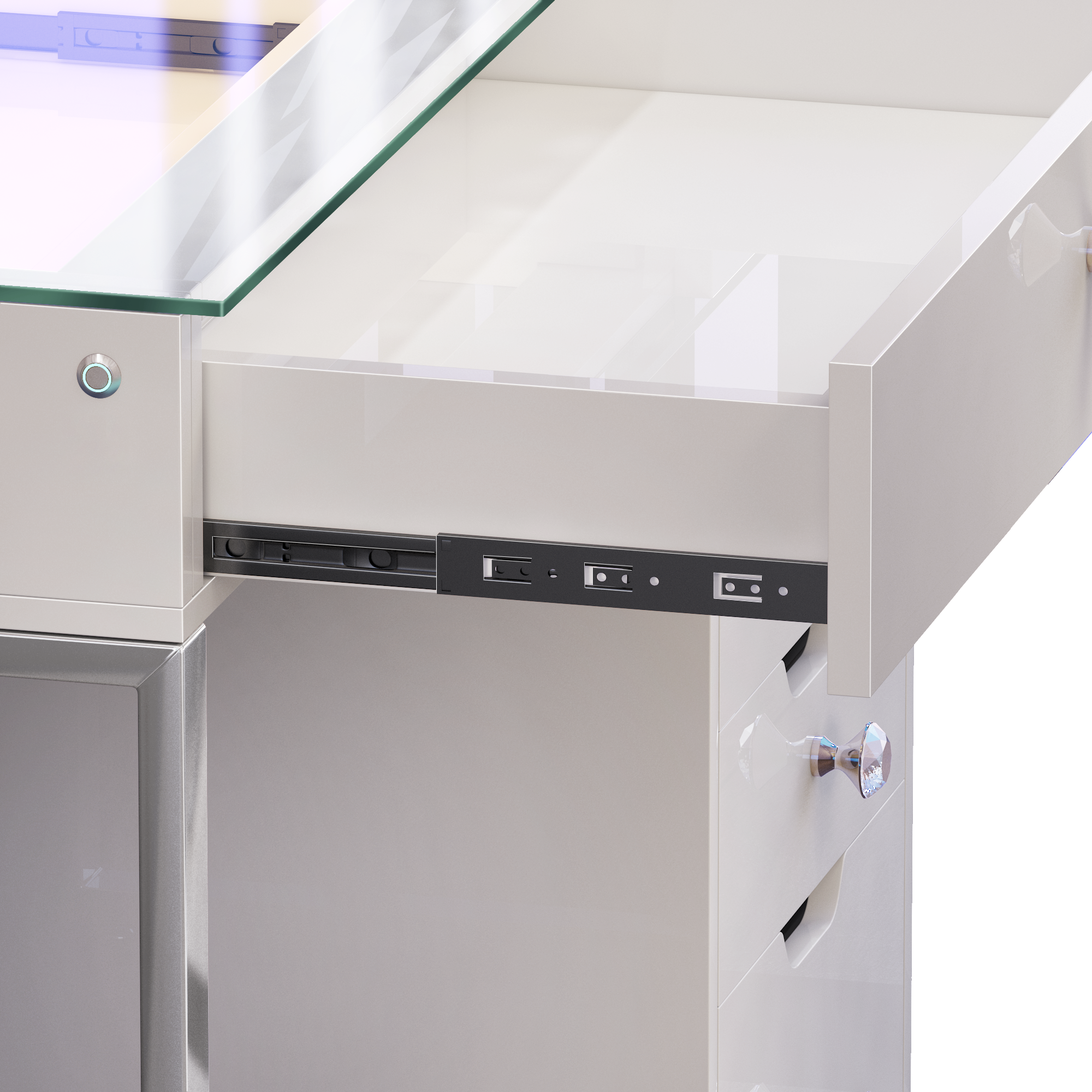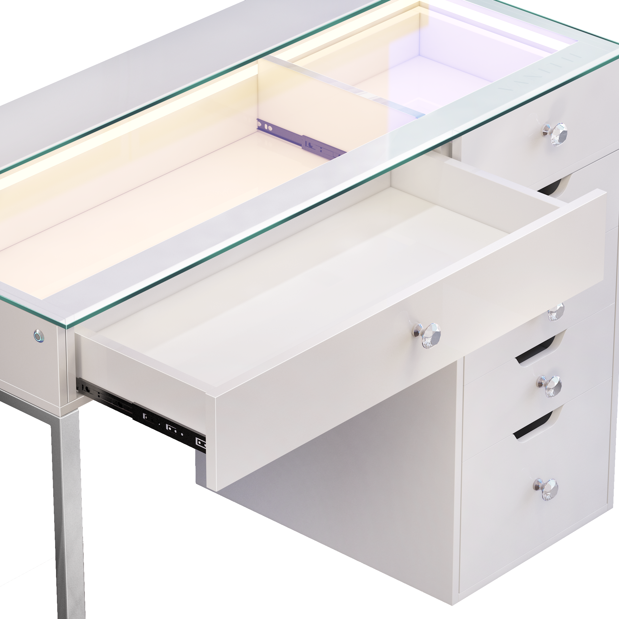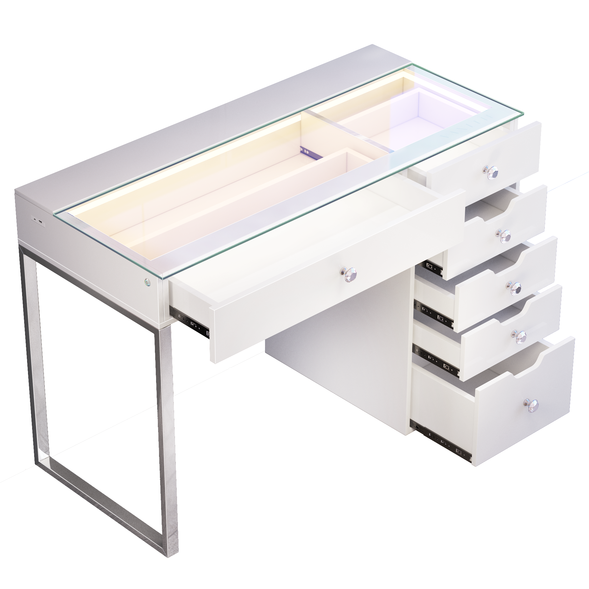 The built-in LED light strip enhances the charm of the jewelry storage space. Additionally, there is a USB port on the left side of the desk for convenient phone charging.