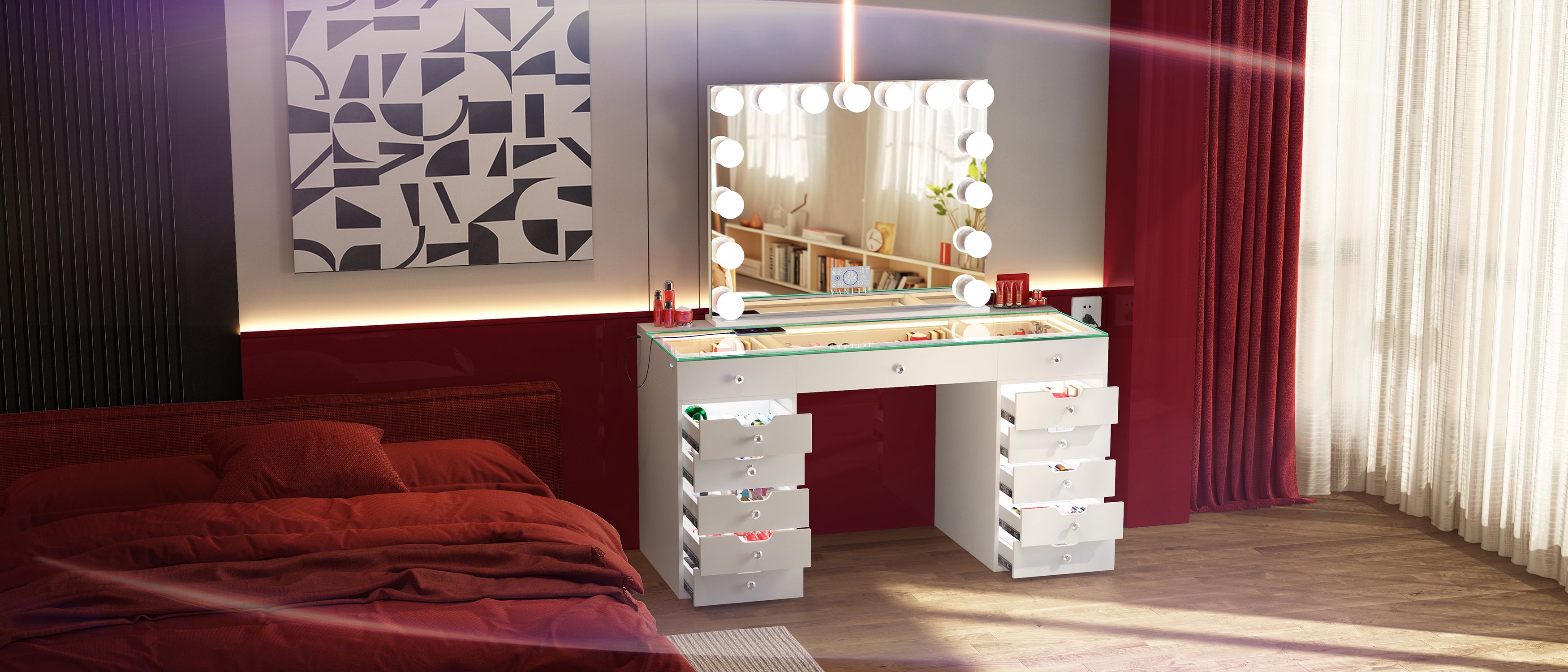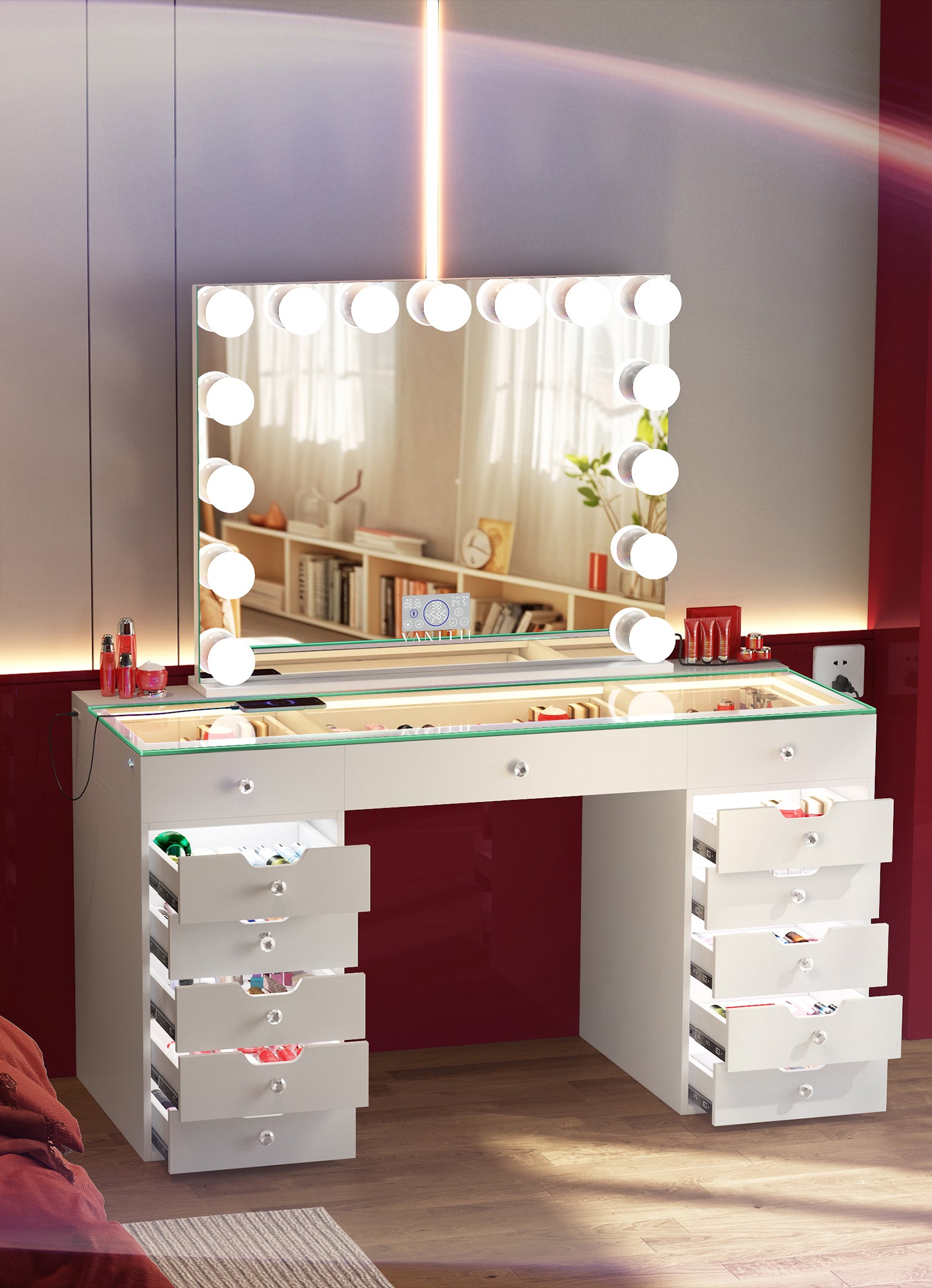 VANITII Eva Vanity Desk - 13 Storage Drawers with Full Light