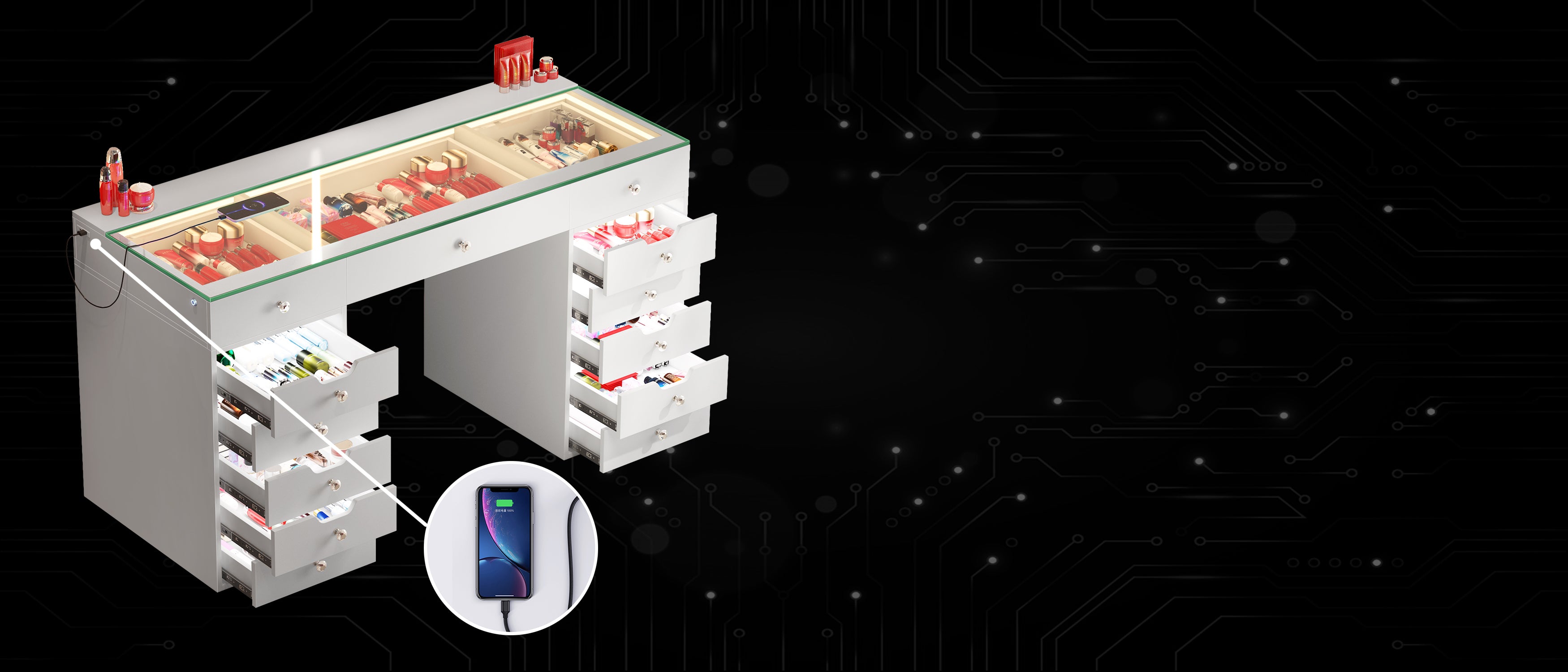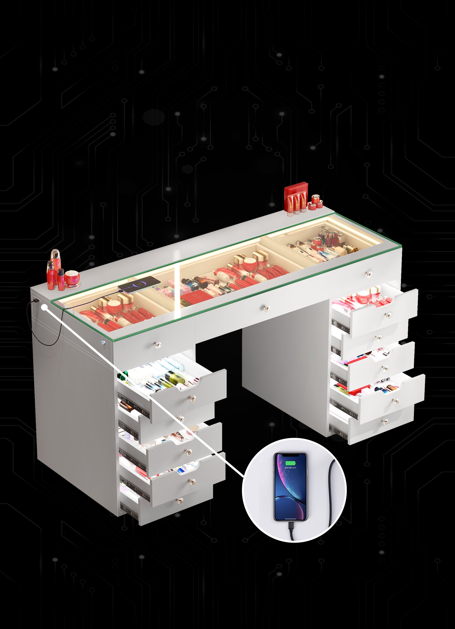 The built-in LED light strip enhances the charm of the jewelry storage space. Additionally, there is a USB port on the left side of the desk for convenient phone charging.