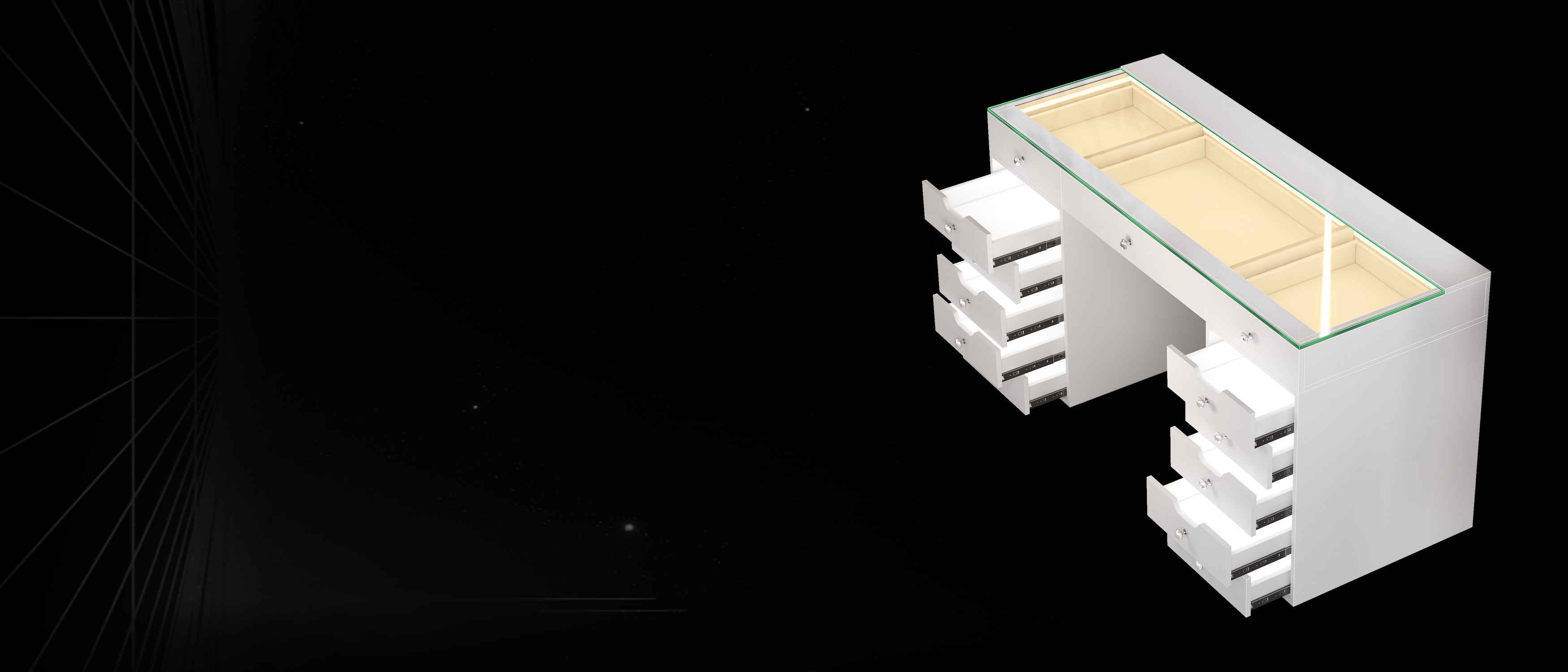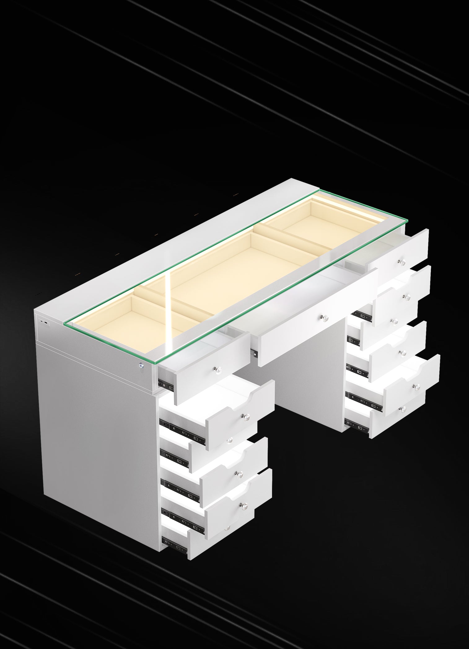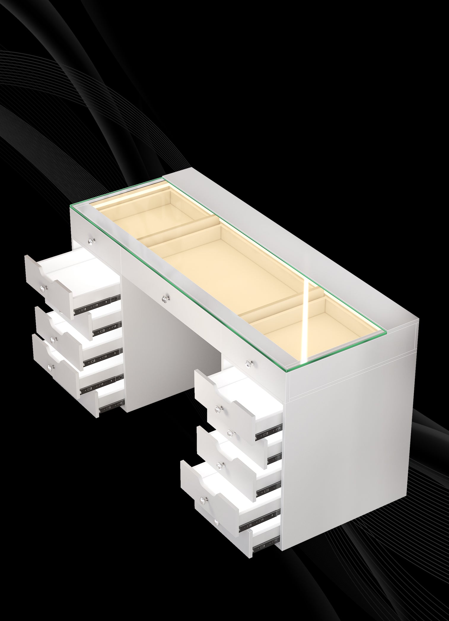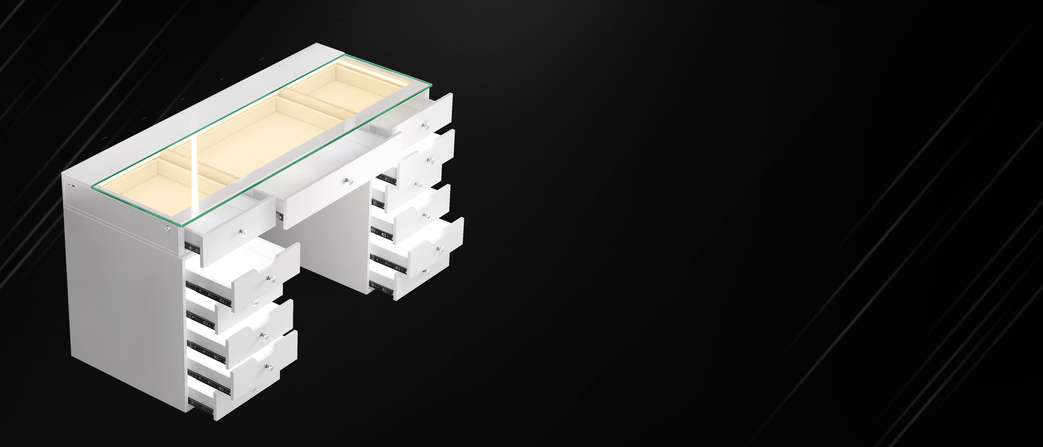 Multi-purpose Storage Drawers - 13 soft close large table drawers to help you organize your accessories.