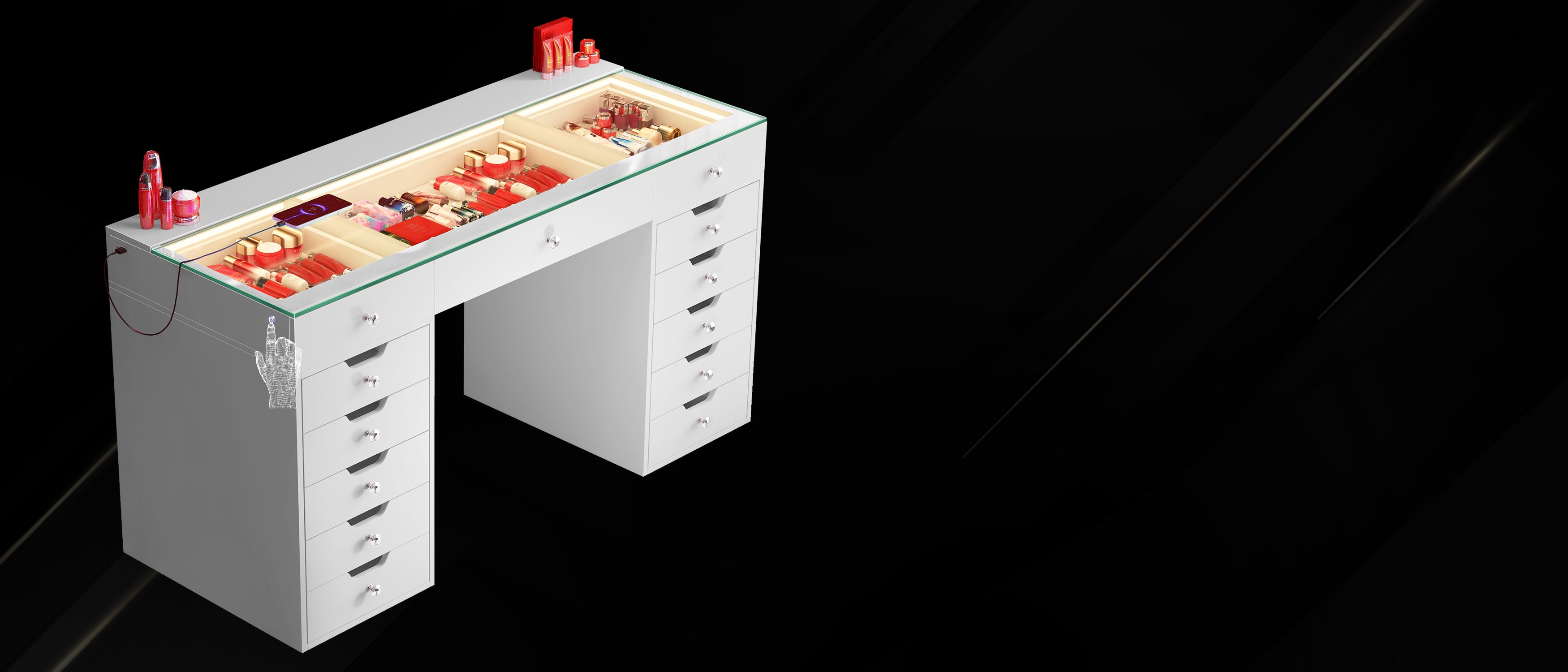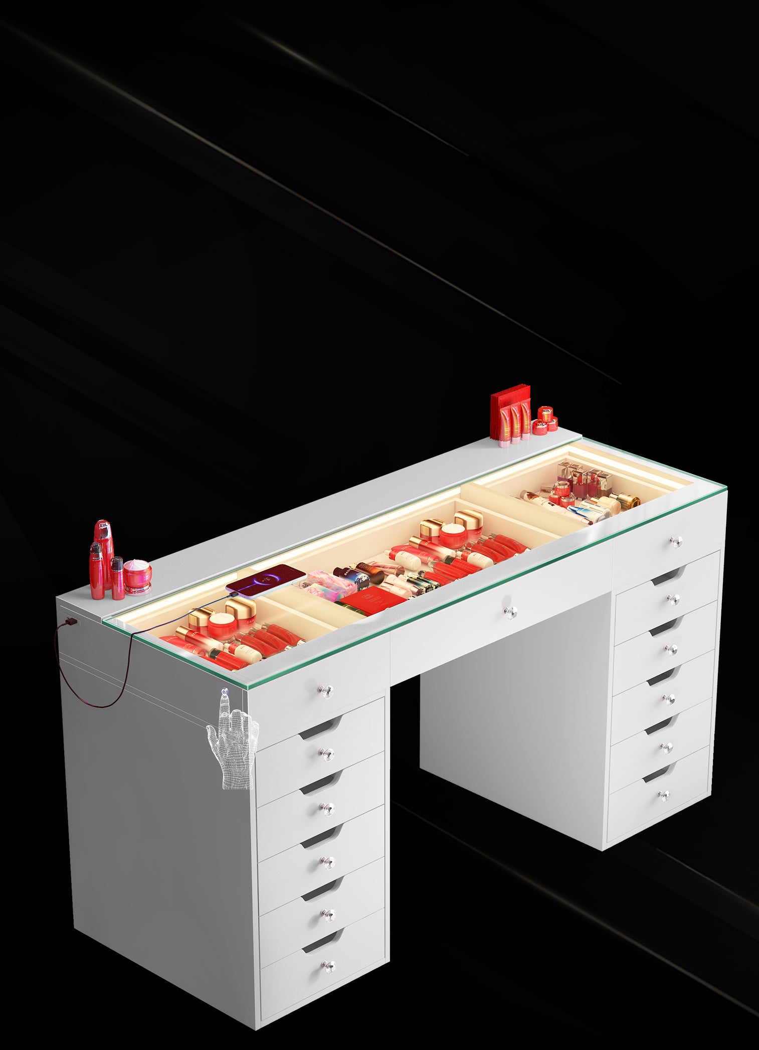 The built-in LED light strip enhances the charm of the jewelry storage space. Additionally, there is a USB port on the left side of the desk for convenient phone charging.