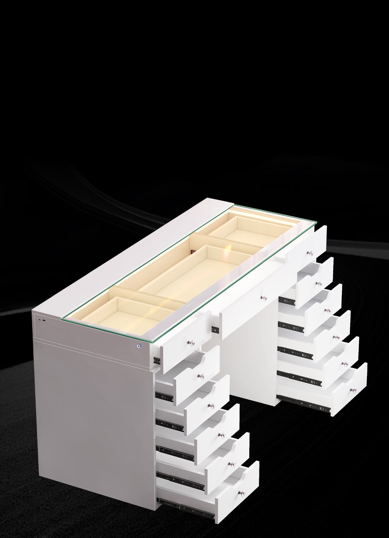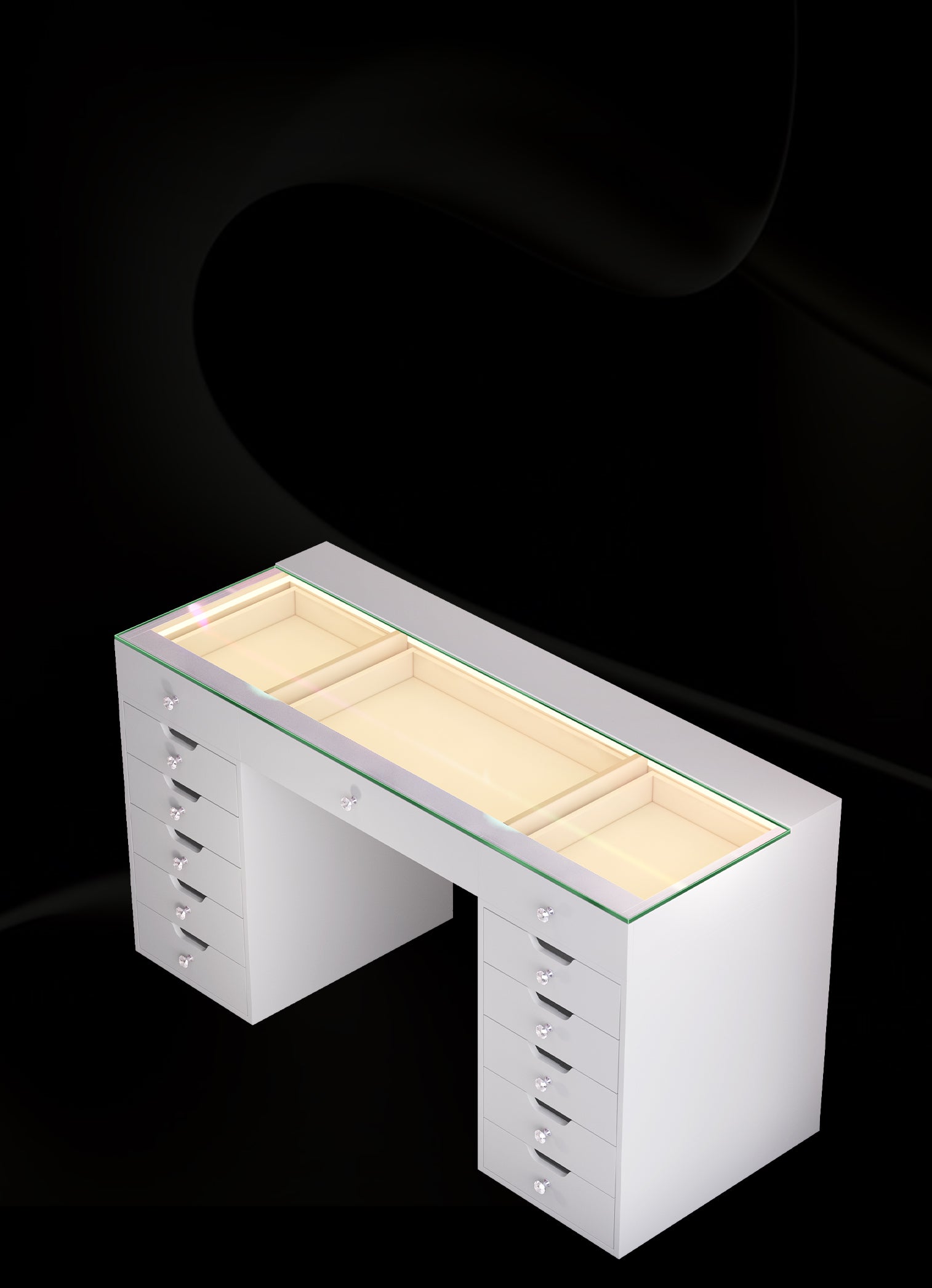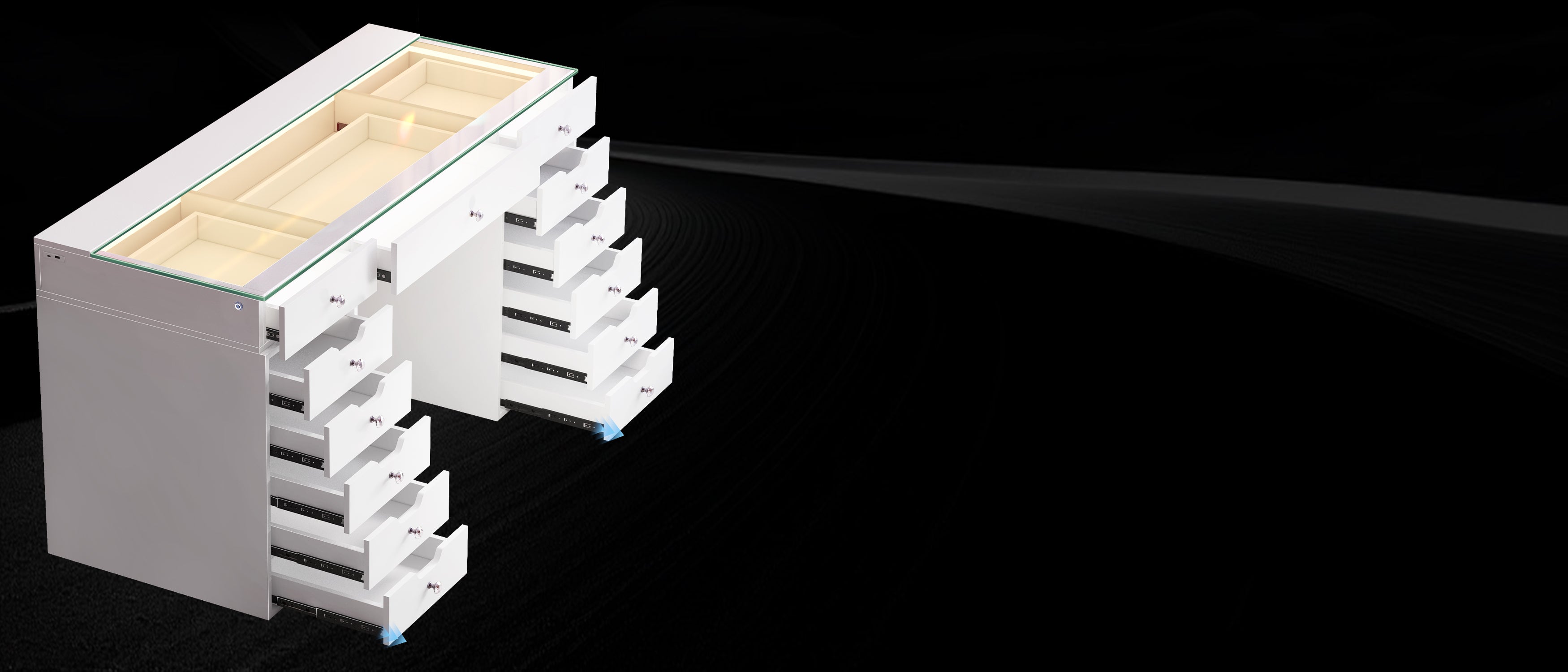 Multi-purpose Storage Drawers - 13 soft close large table drawers to help you organize your accessories.