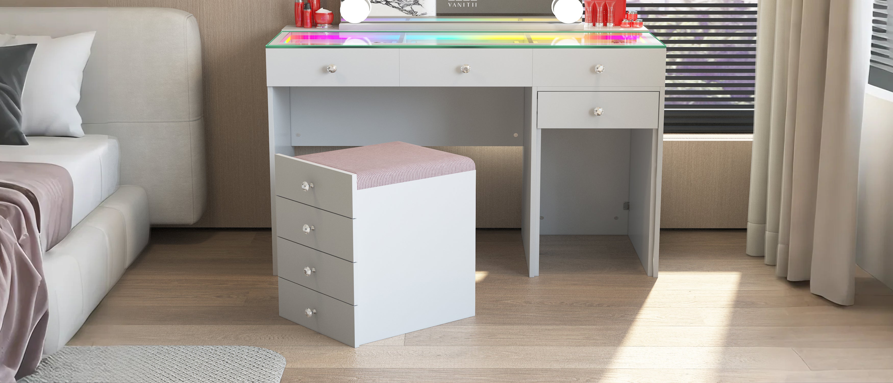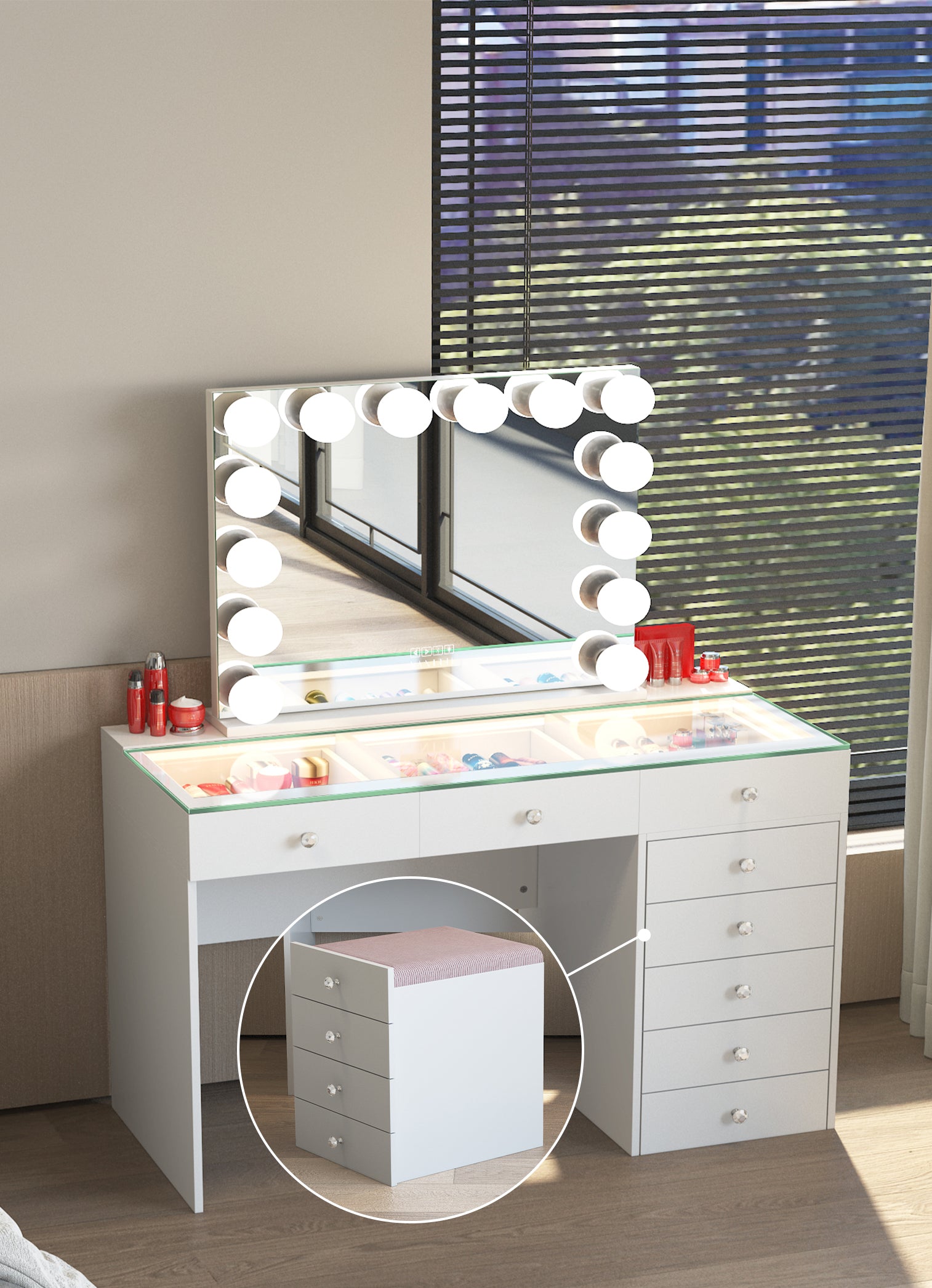 New Release ! VANITII Diana 8 Drawers Vanity Desk Includes a Soft Hidden Stool With Marilyn Vanity Mirror