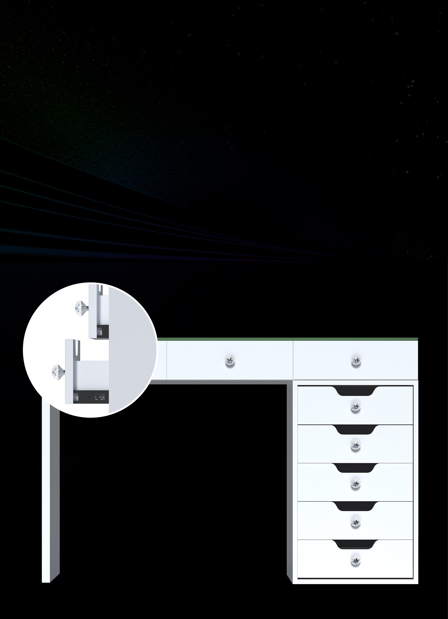 The built-in LED light strip enhances the charm of the jewelry storage space. Additionally, there is a USB port on the left side of the desk for convenient phone charging.