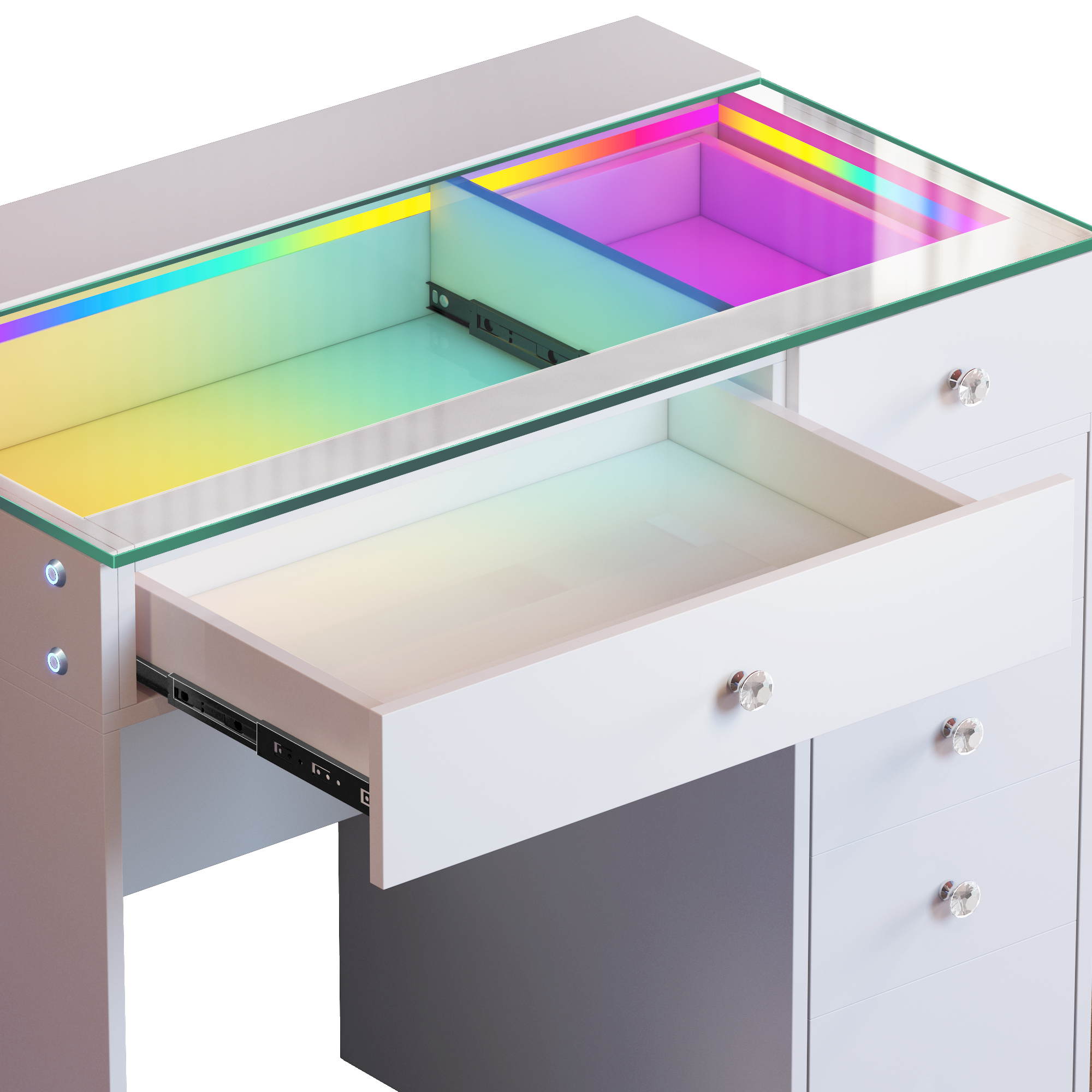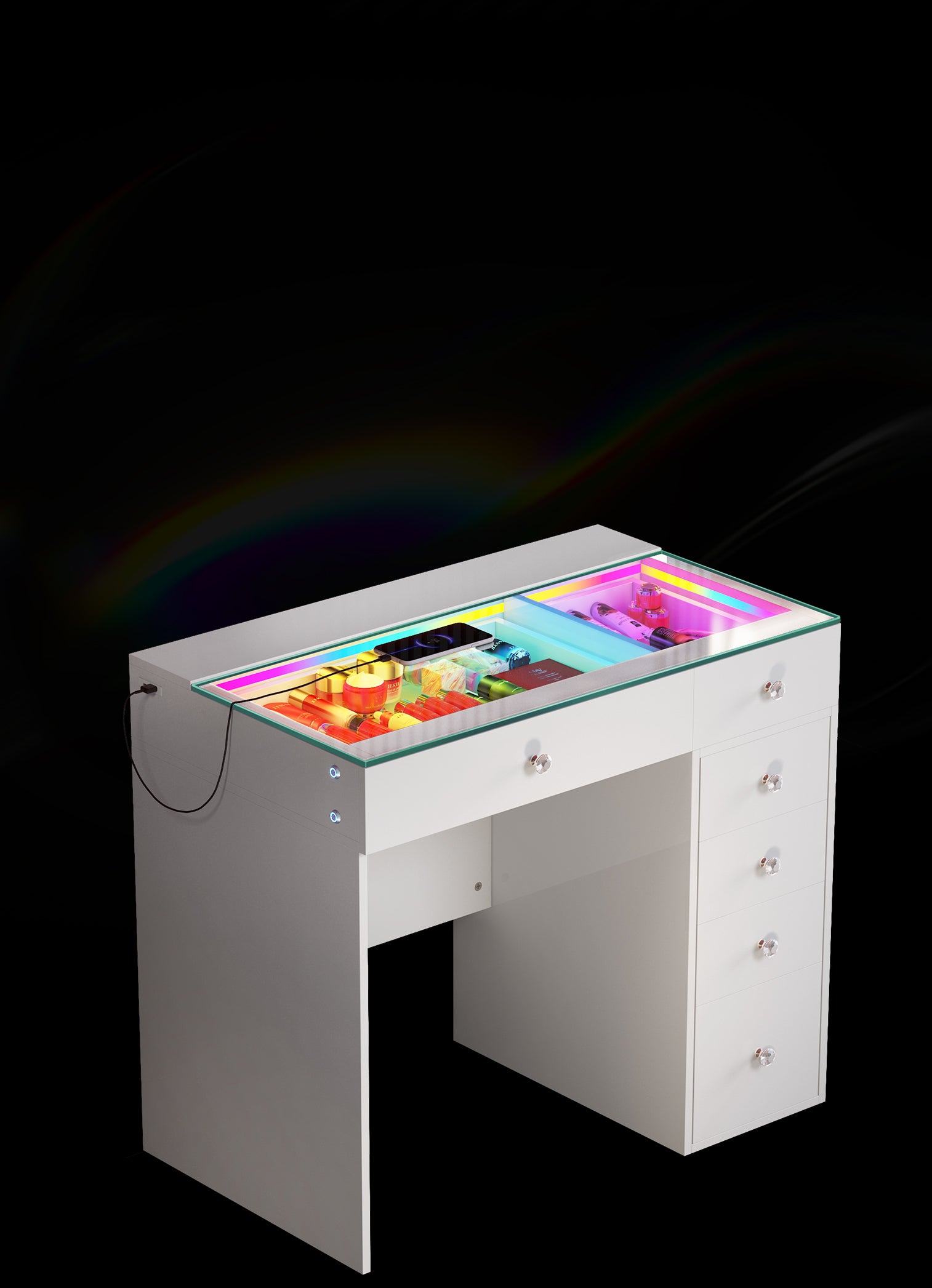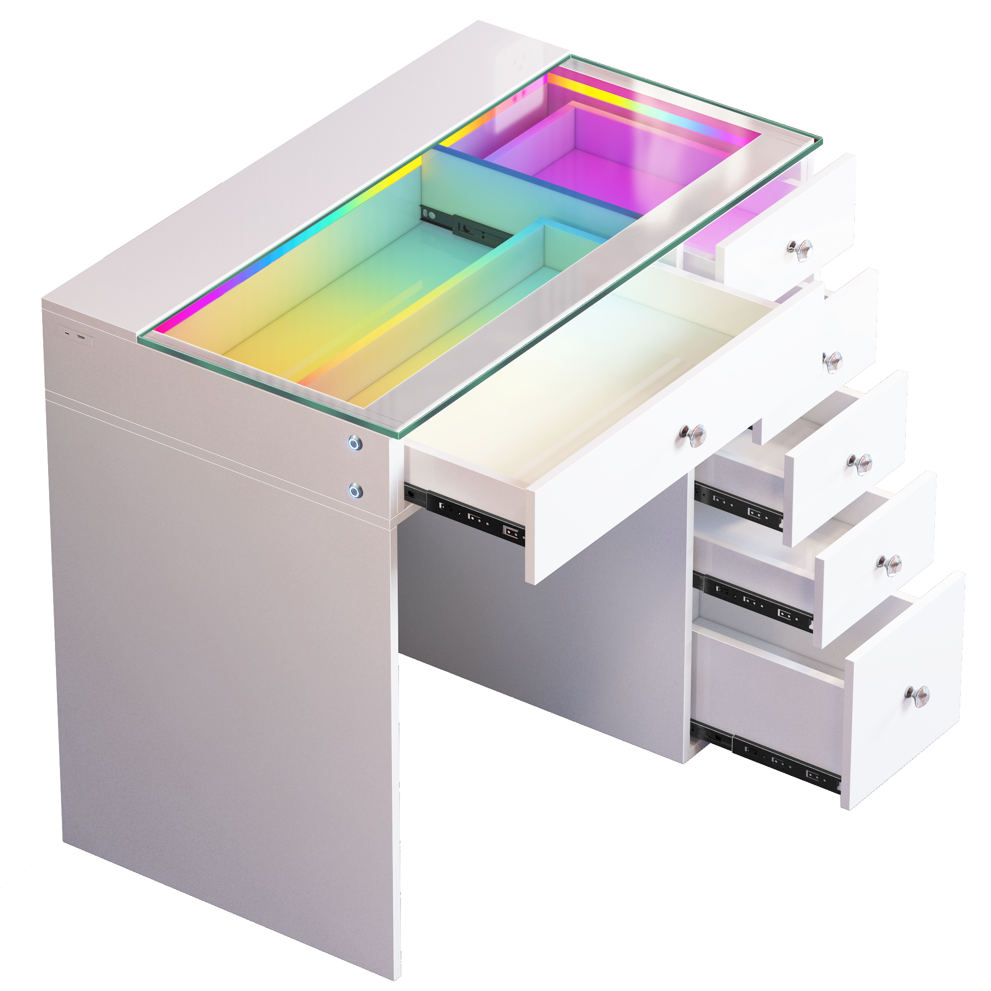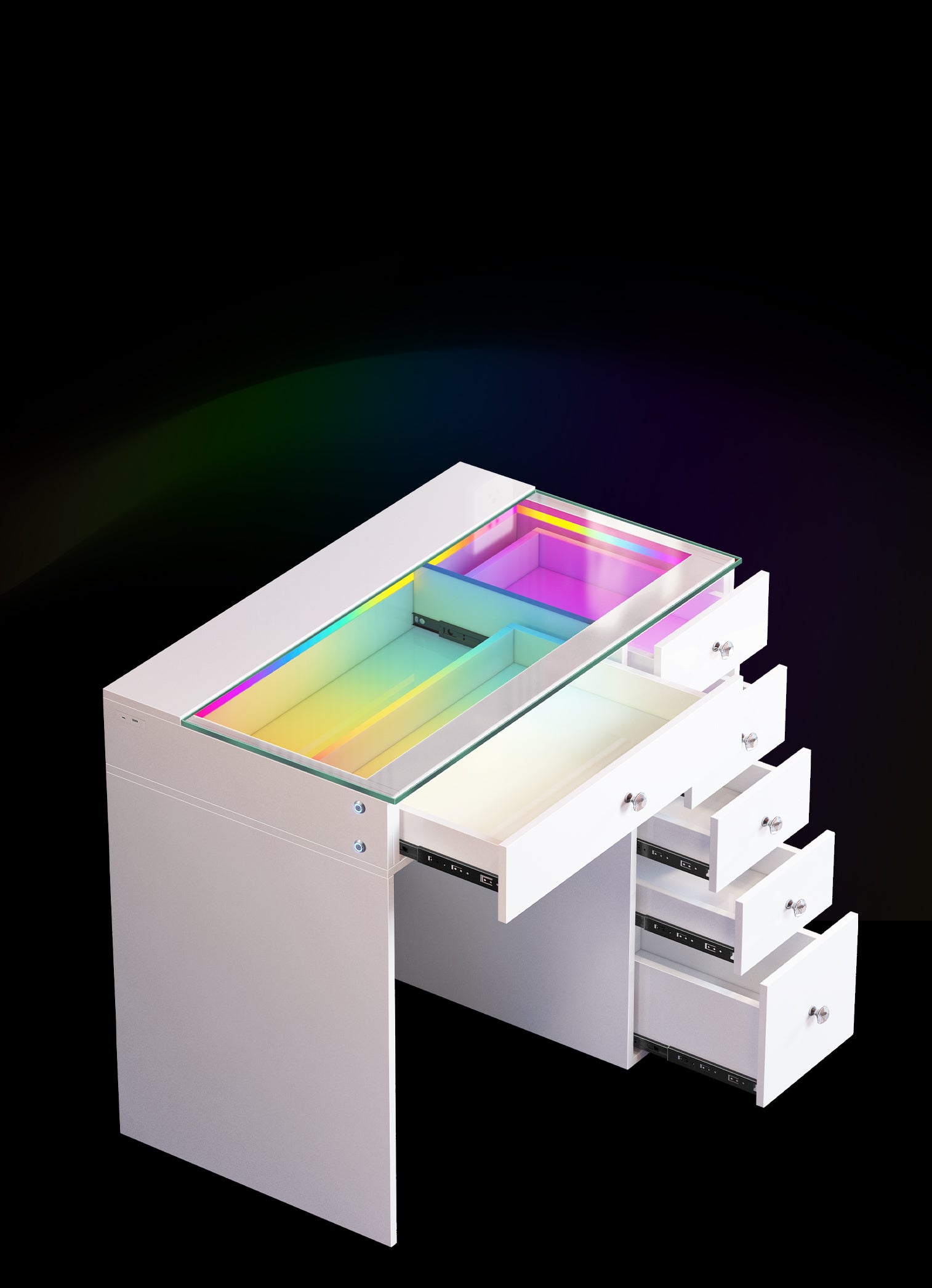 The built-in LED light strip enhances the charm of the jewelry storage space. Additionally, there is a USB port on the left side of the desk for convenient phone charging.