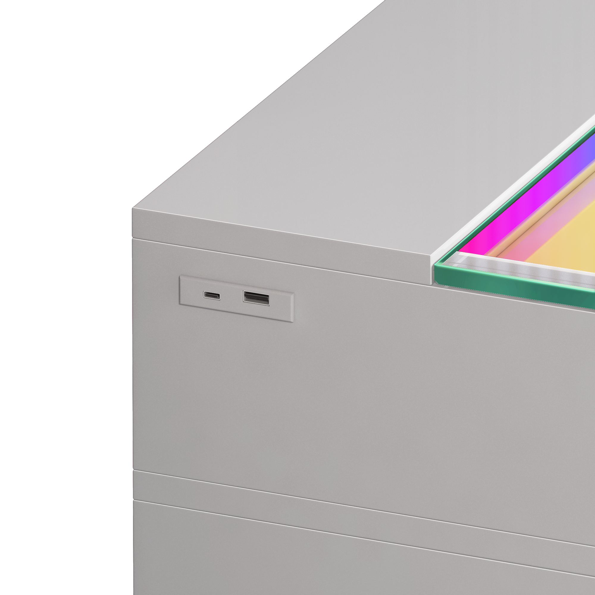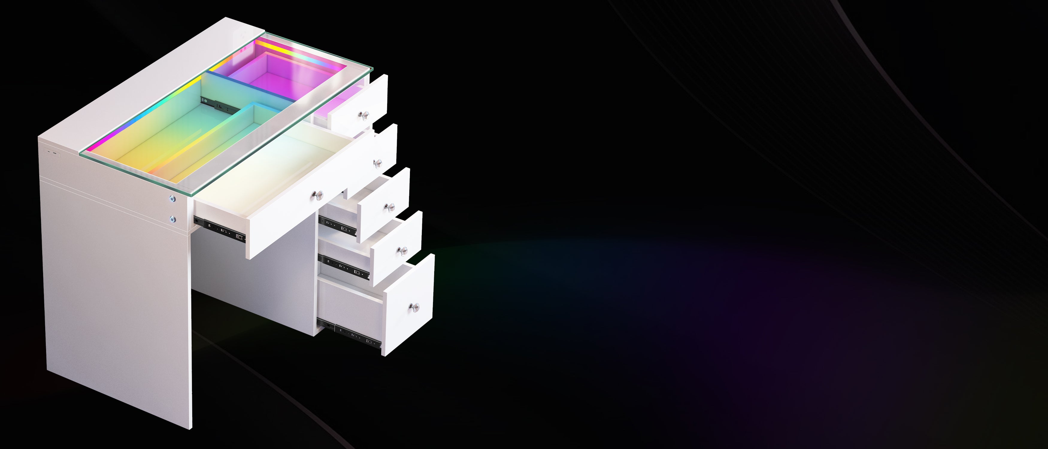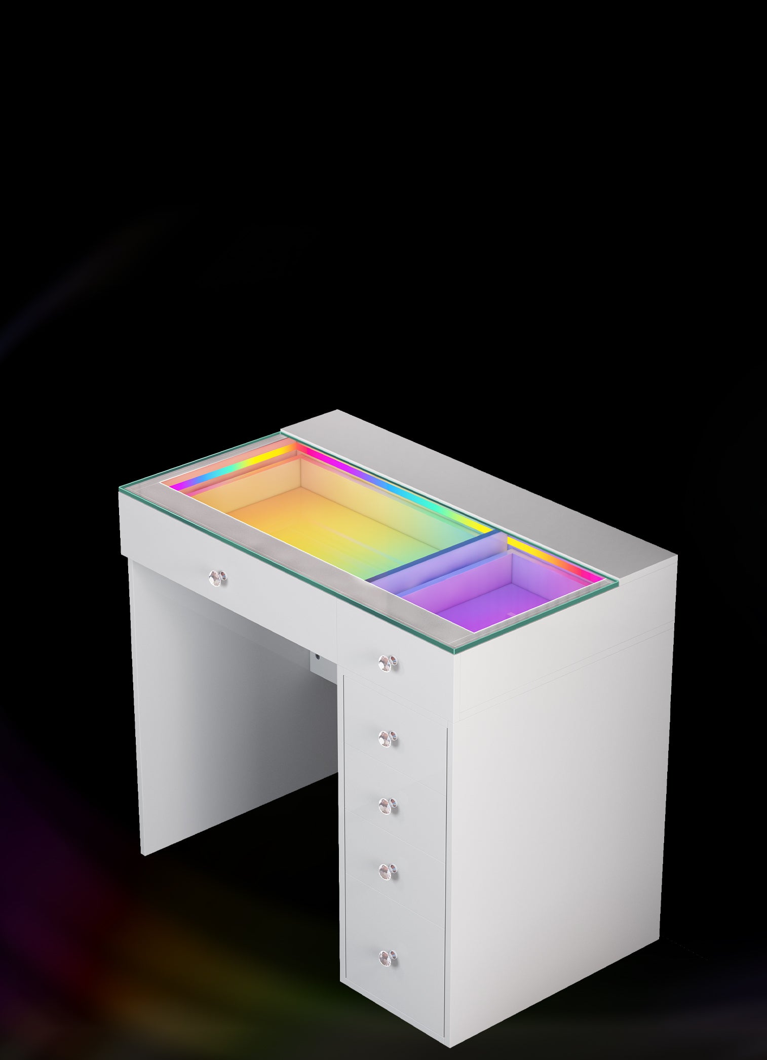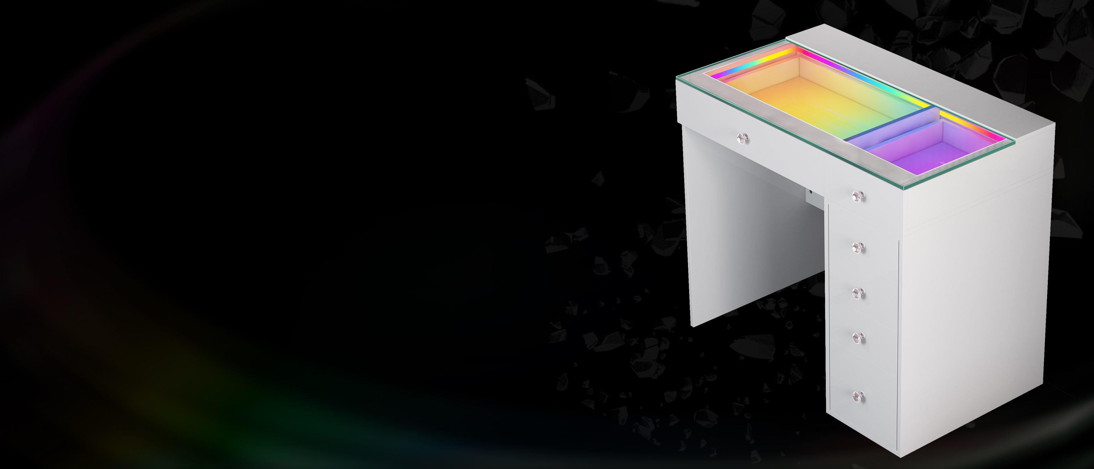 The built-in LED light strip enhances the charm of the jewelry storage space. Additionally, there is a USB port on the left side of the desk for convenient phone charging.