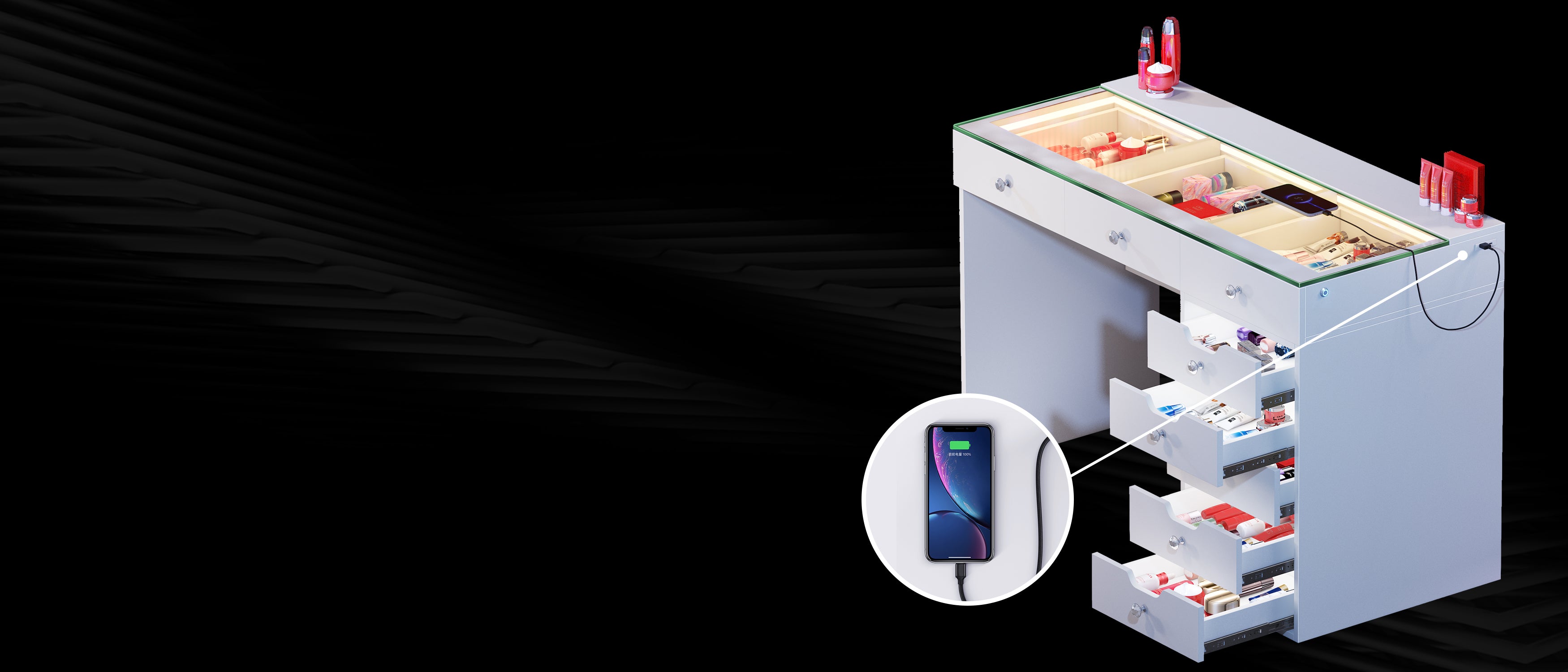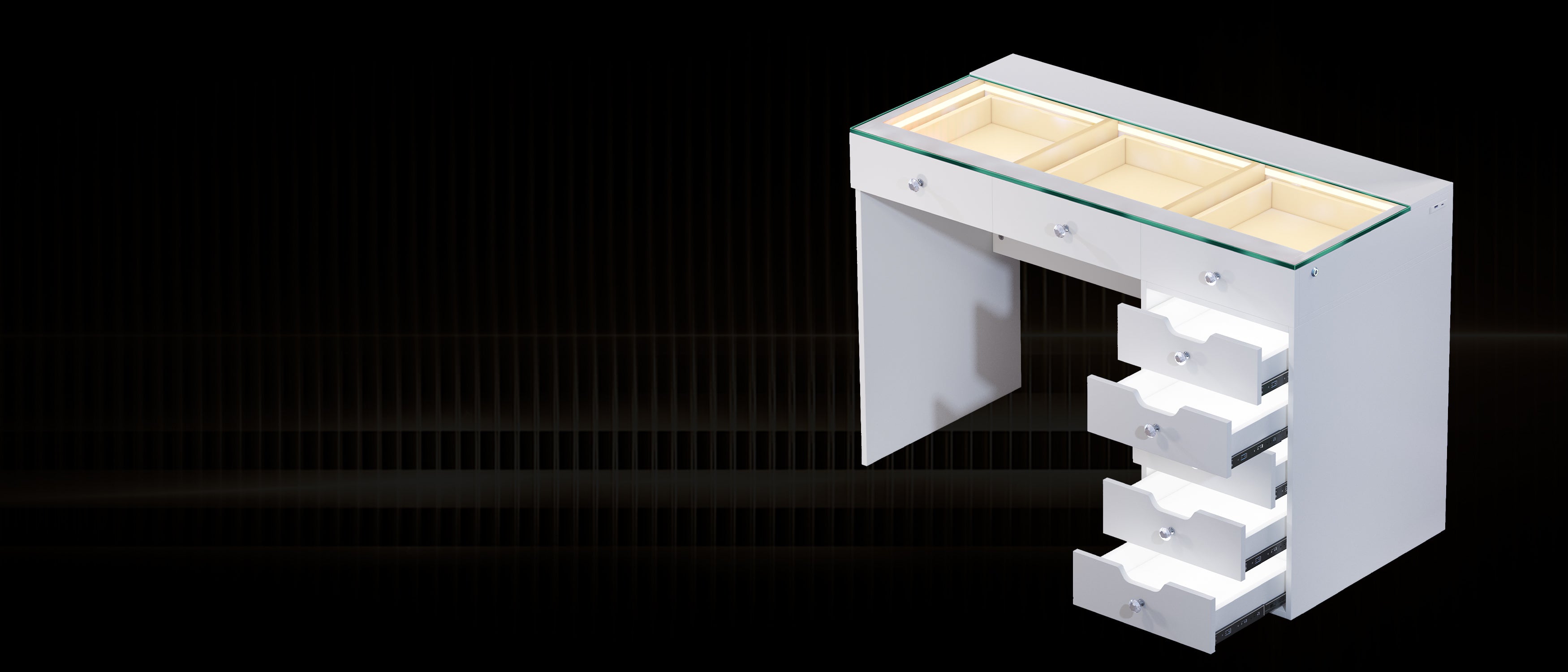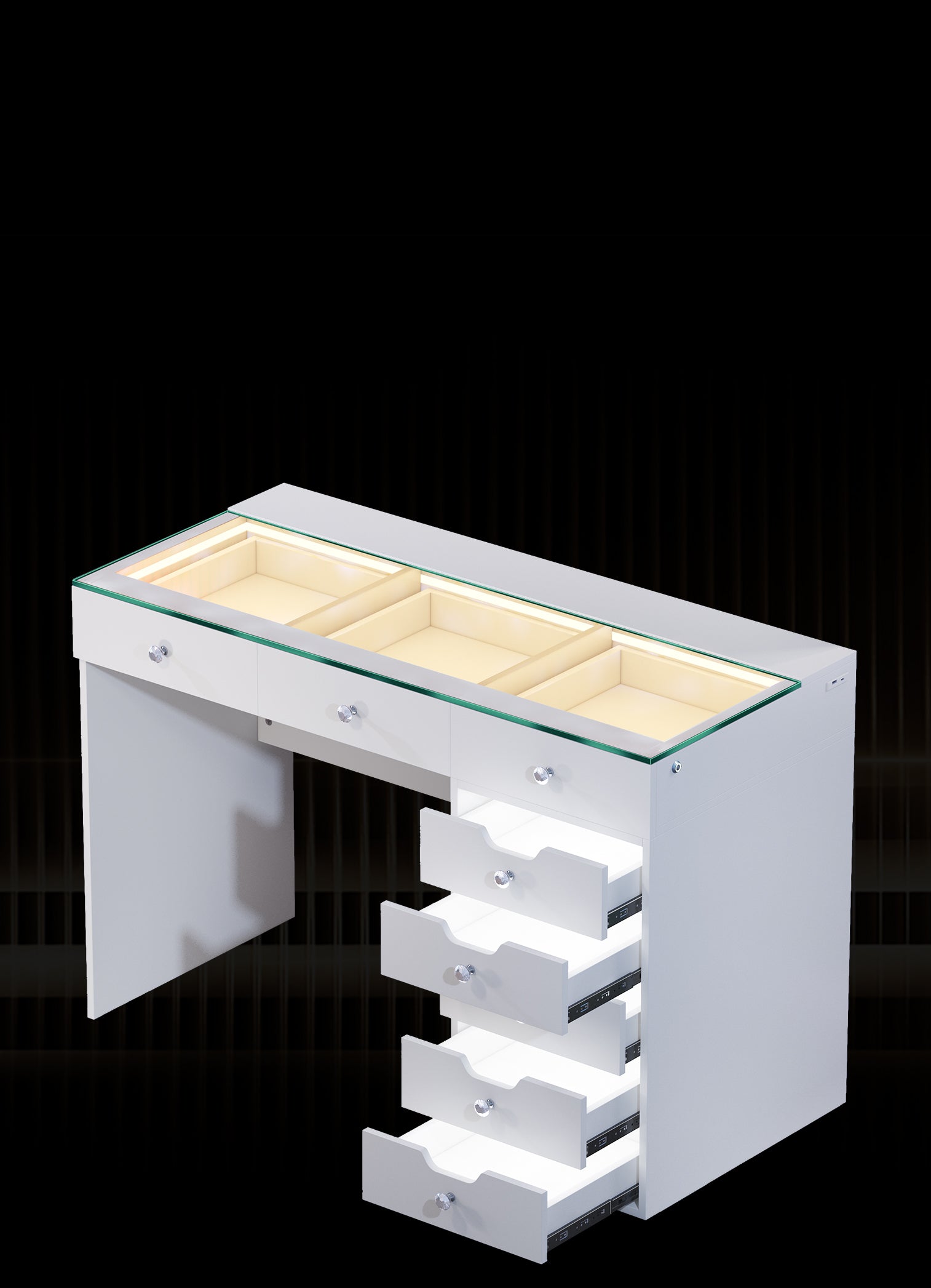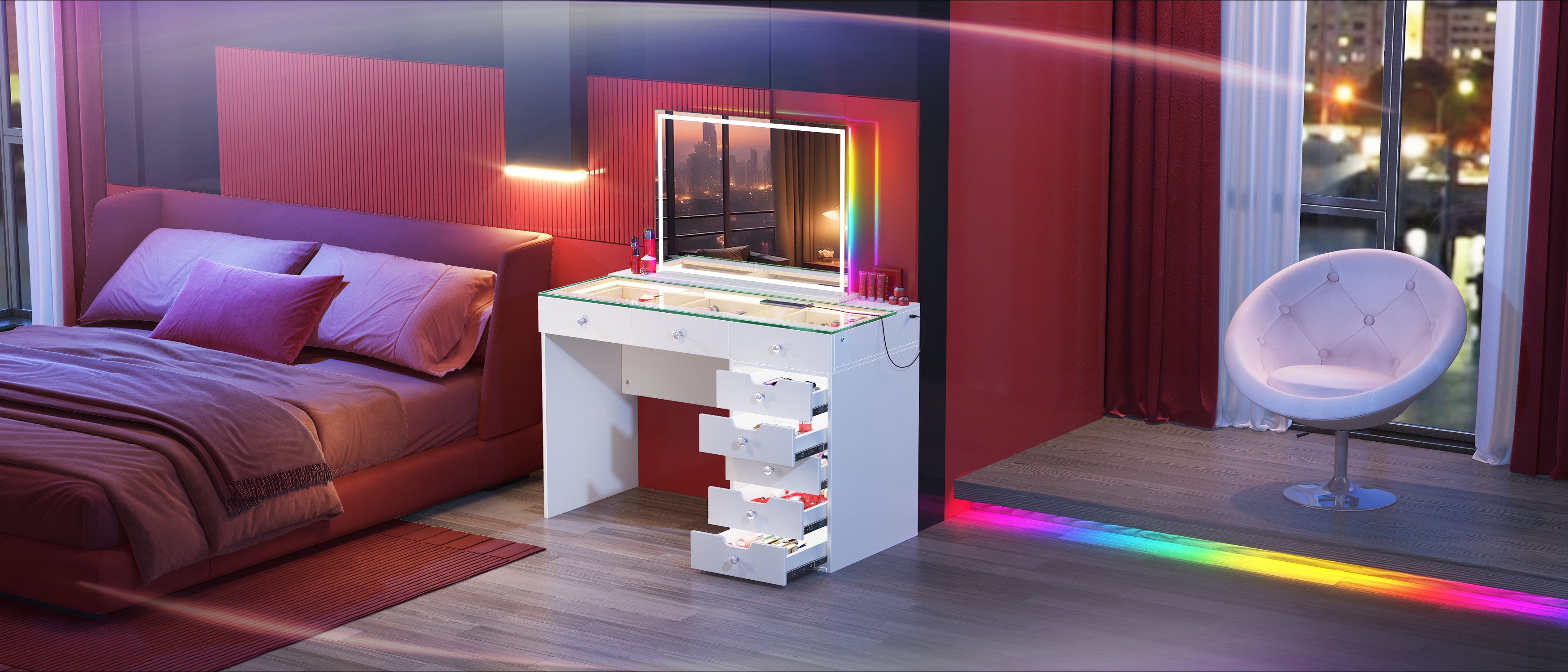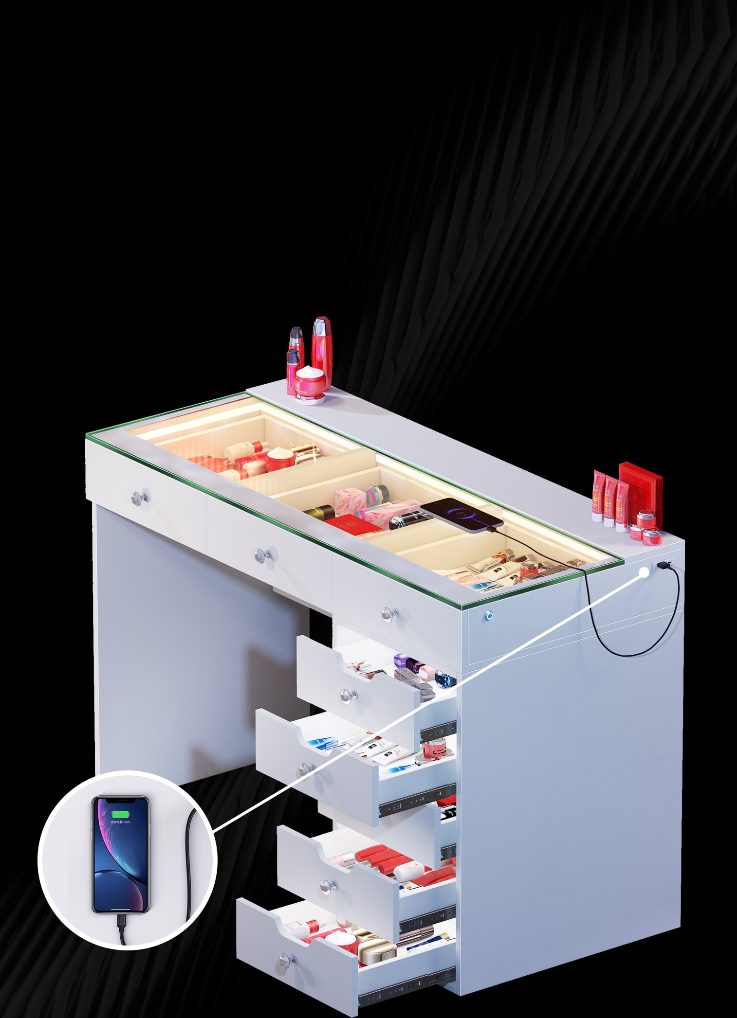The built-in LED light strip enhances the charm of the jewelry storage space. Additionally, there is a USB port on the left side of the desk for convenient phone charging.